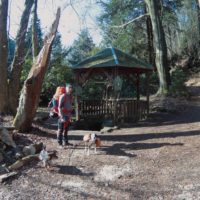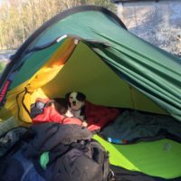 Schneller als gedacht sind wir an der Kamphütte. Leider liegt sie direkt an einem Forstfahrweg, das ist nicht gerade gemütlich. Ich baue mein Zelt an einer freien Ecke auf, denn Hunde sind in den Hütten nicht erlaubt. Da es an der Hütte kein Wasser gibt, laufen wir noch eine kleine Runde zu einer nahegelgenen Quelle. Wir füllen alle vorhandenen Flaschen, es soll ja bis morgen reichen.