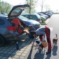Am Nachmittag hält es sich mit den Auf- und Abstiegen in Grenzen. Zwei kurze Leitern sind noch dabei, aber selbst diese sind mit Hund gut zu bewältigen. Lia und Dori tragen Geschirre, mit zusätzlichem Bauchgurt. Da kann man schnell mal am Henkel des Geschirrs zupacken und sie unterstützen oder heben. Rausrutschen können sie dabei nicht. Praktisch, so ein Henkel 😉