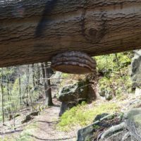 Im Gelobtbachtal wandern wir weiter Richtung Großer Zschirnstein. Den gilt es dann auch zu erklimmen, und dabei macht sich das Rucksackgewicht schon bemerkbar. Oben angekommen belohnen wir uns mit einer Mittagspause und genießen den fantastischen Ausblick. Wald soweit das Auge reicht, nur unterbrochen von den typischen Felsformationen des „Elbis“.