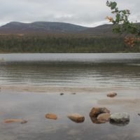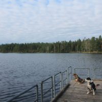 Nach einigen Kilometern, fast 2/3 der Tagesstrecke, geht es hinab ins Tal, zum See Hävlingen. Ein Birkenwald empfängt uns, durch den wir weiter laufen, bis zum Seeufer. Das Wasser ist kristallklar und kleine Wellen kräuseln die Oberfläche. Und noch etwas gibt es: Steine so weit das Auge reicht! Teilweise riesige Brocken, und wir klettern mehr als das wir laufen. Die Hunde springen einfach von einem Stein zum anderen, für mich ist es mit dem Rucksack etwas komplizierter. So geht es ein Stück am Seeufer entlang und an einer Landzunge mit Brücke hinüber zum anderen Ufer. Man streift hier den Töfsingsdalen Nationalpark.