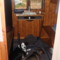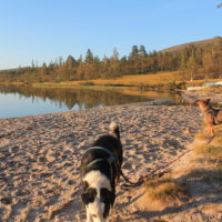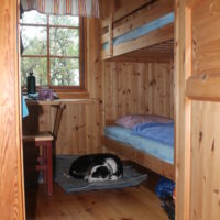 Wir können das Tagesziel von hier oben sehen, das ist noch ein gutes Stück bis dahin. Die Rogenhütte liegt natürlich im Tal, natürlich mit Wald…natürlich mit Steinen. Das letzte Stück Weg führt direkt am Seeufer entlang, und es gibt sogar teilweise Sandstrand. Hinter einer Biegung liegt idyllisch die Rogenhütte des STF. Hier wollen wir zwei Nächte bleiben, und am nächsten Tag eine Tageswanderung unternehmen. Das Hundezimmer haben wir ganz für uns allein, und es gibt nur einen anderen Gast.