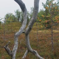 Von hier geht es ca. drei Kilometer durch wunderschönen alten Wald. Die Stämme der Bäume sind bizarr verdreht und wettergegerbt. Was bleibt sind die Steine, sie machen das Laufen ganz schön mühsam. Aber dafür ist das Rogengebiet wohl bekannt. Dori scheucht noch ein paar Fjällripa hoch, bevor wir wieder in offene Landschaft kommen. Es sind noch ungefähr zwei Kilometer bis zum Slagusjön, an dem eine weitere Schutzhütte steht. Hier wollen wir die Nacht verbringen. Es läuft sich jetzt leichter, denn der Weg ist mit Holzbohlen ausgelegt. Eine Wohltat!