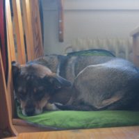 Am Seeufer findet sich eine wunderschöne Vindskyd, und wir machen eine lange Pause. Während ich esse nutzt Lia die Zeit für ein Nickerchen, nur Dori scannt permanent die Gegend. Zu viele Gerüche für die kleine Spürnase.