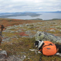 Es geht los! Alle drei die Rucksäcke geschultert, und wir brechen auf. Die Hunde sehen mit ihren kleinen Packtaschen aus wie die größten Welteroberer. Fröhlich laufen sie vorran. Vorbei an der großen Bergstation des STF laufen wir weiter bergan, Richtung Jakobshöjden. Es dauert nur ein paar Minuten, und wir sind im baumlosen Fjäll unterwegs. Der Weitblick ist jedes mal aufs Neue überwältigend. Wir haben übrigens bestes Wetter, Sonne satt. Hier kommen wir gut vorran, und legen an der Rasthütte Särsjöbäcken eine kleine Pause ein, um die Sonne und den Ausblick zu genießen.