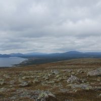 Als wir endlich aus dem Wald heraus ins Hochfjäll kommen, fängt es an zu regnen. Regenklamotte an und weiter gehts. Ab jetzt im Sauseschritt, denn der Weg ist ebener. Trotz der trüben Wetters haben wir einen fantastischen Weitblick auf die runden Kuppen der Berge, bewaldete Täler und die Seen.