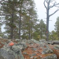 Plötzlich habe ich das Gefühl, die Richtung stimmt nicht mehr. Mir wird bewusst, das ich vor allem dem Pfad gefolgt bin, aber nicht mehr auf die roten Markierungen geschaut habe. Wo war die Letzte? Ein Blick auf die Karte gibt auch keine 100%ige Auskunft, beim Maßstab 1 : 100 000 wäre dies auch zu viel erwartet. Hier ist noch ein Pfad, und ein Steinmännchen…ein Bisschen hin und her…noch ein paar Meter in den Wald…aber das ist es nicht! Nun will ich lieber wieder zurück gehen, aber wolang ist zurück? Irgendwie sieht ein Baum aus wie der Andere. Na prima!